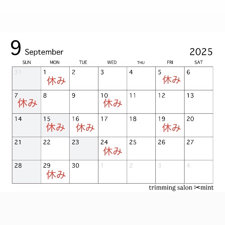こんにちは☀️9月の営業スケジュールのお知らせです📢8月後半はまとまったお休みを頂き、ありがとうございました🙇🏻Ȁ